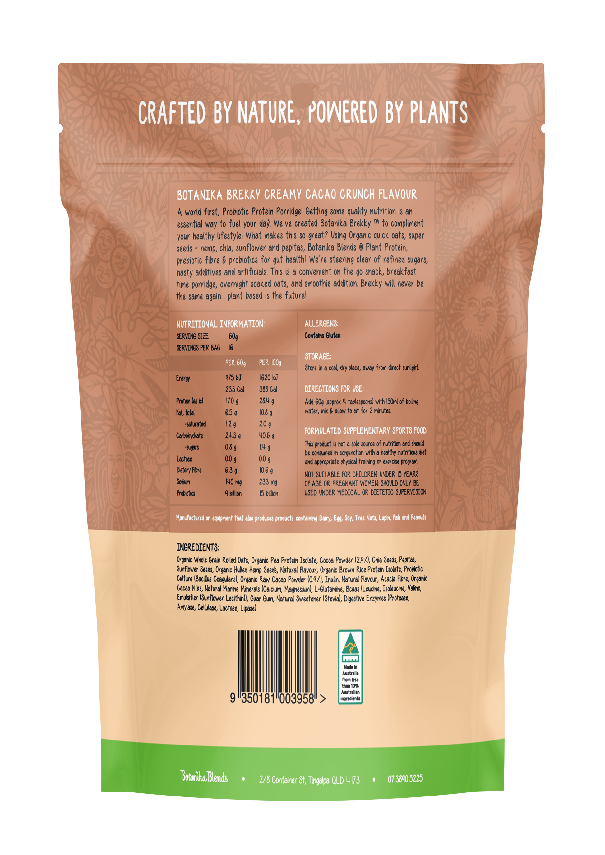 Organic Whole Grain Rolled Oats, Organic Pea Protein Isolate, Cocoa Powder (2.9%), Chia Seeds, Pepitas, Sunflower Seeds, Organic Hulled Hemp Seeds, Natural Flavour, Organic Brown Rice Protein Isolate, Probiotic Culture (Bacillus Coagulans), Organic Raw Cacao Powder (0.9%), Inulin, Natural Flavour, Acacia Fibre, Natural Marine Minerals (Calcium, Magnesium), L-Glutamine, Bcaas (Leucine, Isoleucine, Valine, Emulsifier (Sunflower Lecithin)), Guar Gum, Natural Sweetener (Stevia), Digestive Enzymes (Protease, Amylase, Cellulase, Lactase, Lipase). (ALLERGEN WARNING: CONTAINS GLUTEN)