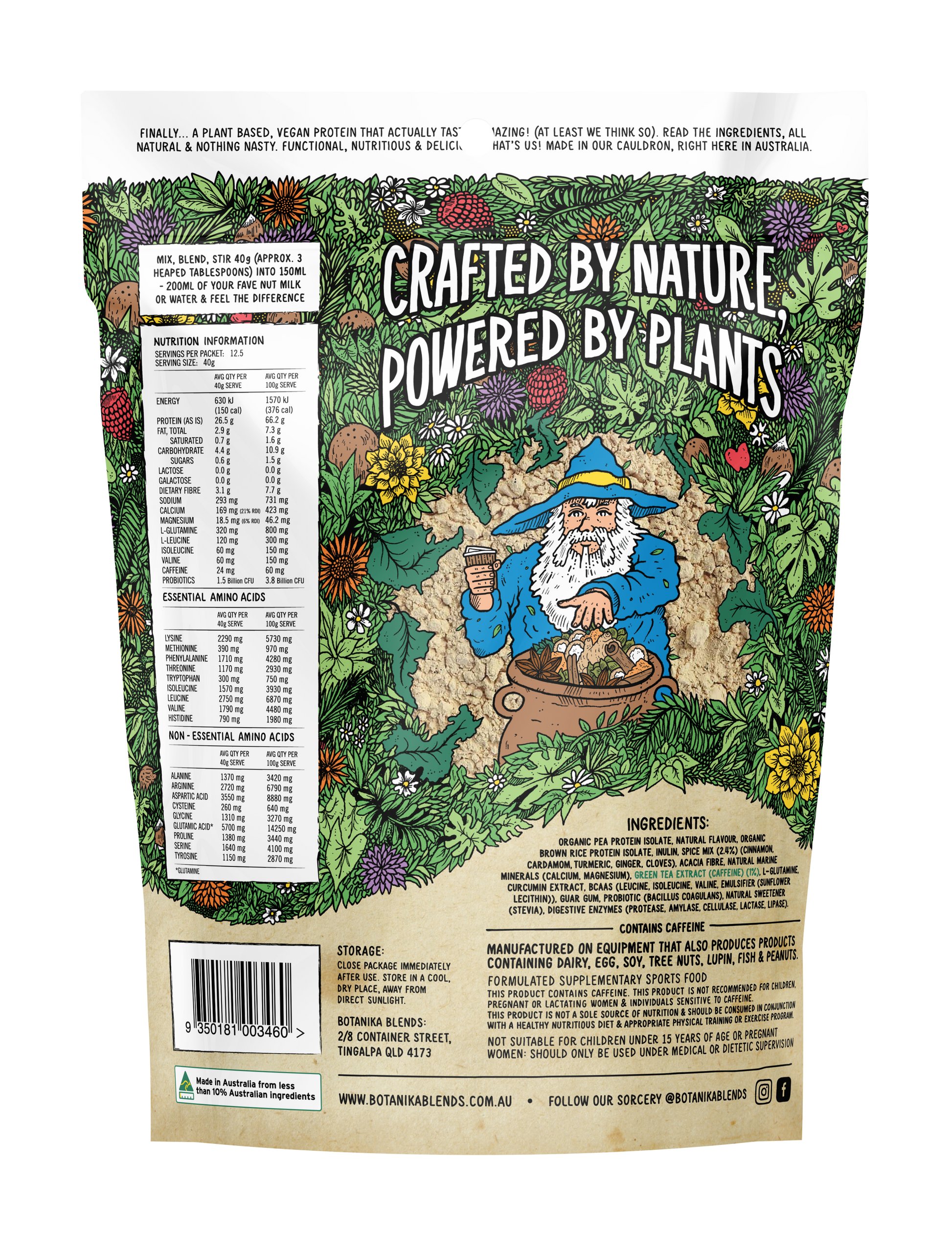 Organic Pea Protein Concentrate, Organic Brown Rice Protein Isolate, Natural Flavours, Inulin, Acacia Fibre, Green Tea Extract, Natural Marine Minerals (Calcium, Magnesium), Spices, L-Glutamine, Curcumin Extract, BCAA (Leucine, Isoleucine, Valine), Guar Gum, Natural Sweetener (Stevia), Probiotic (Bacillus Coagulans), Digestive Enzymes