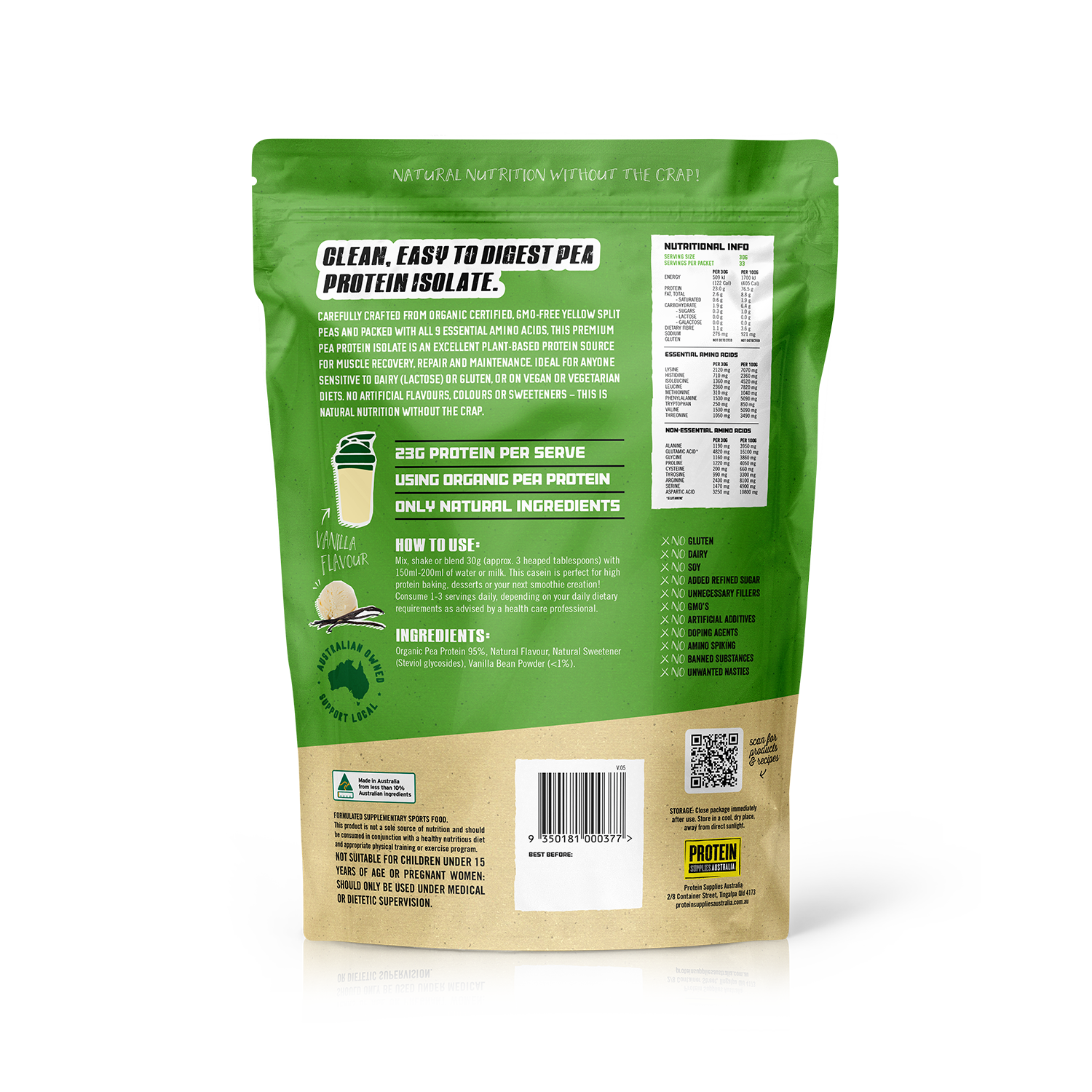 Our Vanilla Pea Protein is hand-crafted using certified organic vanilla, delivering a smooth and creamy natural vanilla flavour. It’s ideal for shakes, smoothies, cooking, and desserts. PeaPro is an excellent alternative for those looking to avoid animal-derived proteins such as whey protein. It's easy to digest, free from commonly used chemicals in extraction, and doesn't contain fillers that reduce protein percentage. Using a delicate low-heat process, the risk of damaging the sensitive proteins (denaturation) is eliminated, ensuring a raw, nutritionally superior, complete protein.