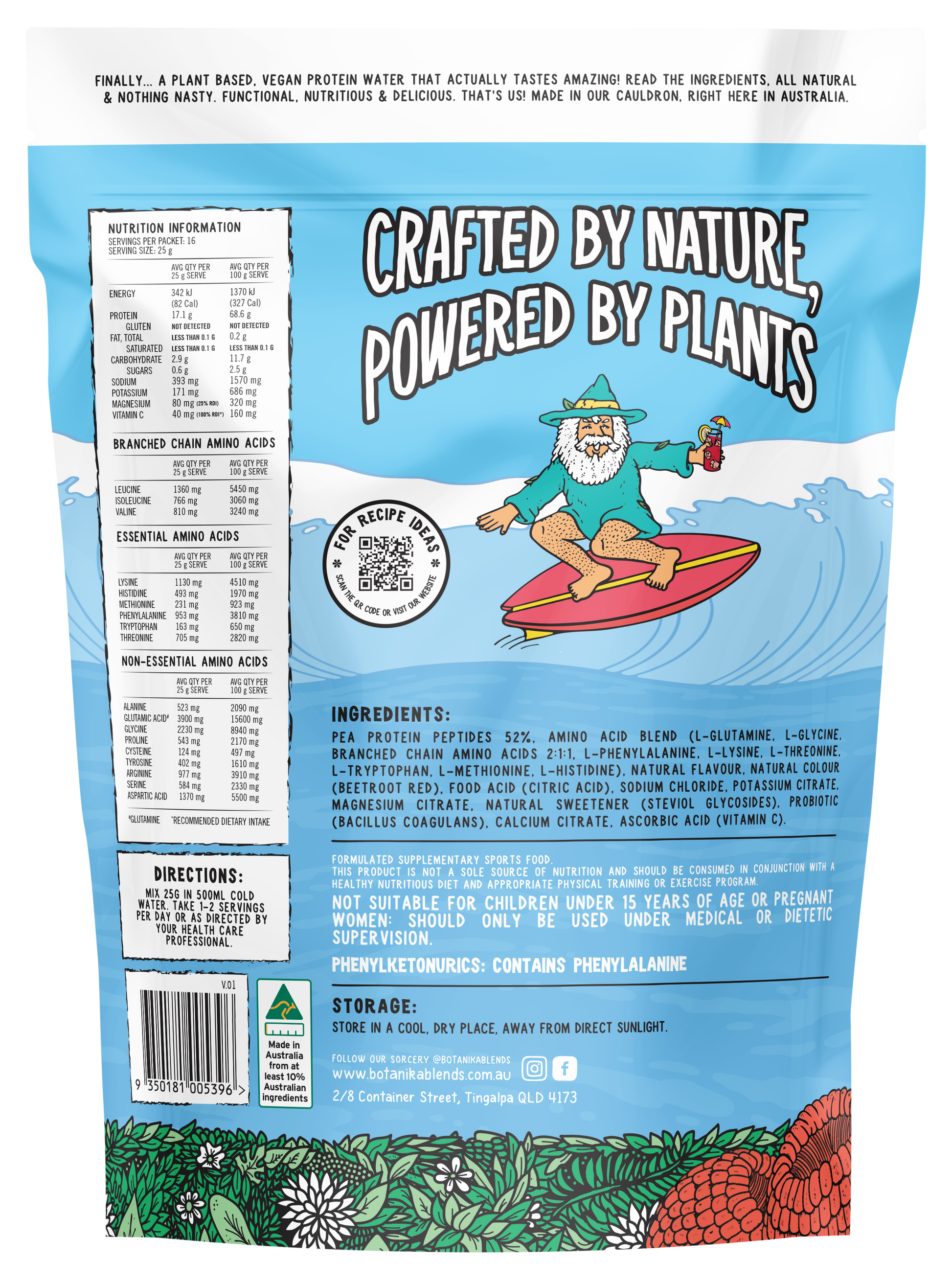 Pea Protein Peptides 52%, Amino Acid Blend (L-Glutamine, L-Glycine, Branched Chain Amino Acids 2:1:1, L-Phenylalanine, L-Lysine, L-Threonine, L-Tryptophan, L-Methionine, L-Histidine), Natural Flavours, Food Acid (Citric Acid), Natural Colours (Beetroot Red, Butterfly Pea Flower Powder, Curcumin), Sodium Chloride, Potassium Citrate, Magnesium Citrate, Natural Sweetener (Steviol glycosides), Probiotic (Bacillus coagulans), Calcium Citrate, Ascorbic Acid (Vitamin C).