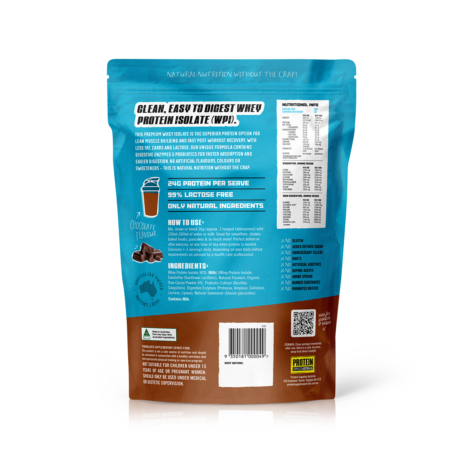 Whey Protein Isolate (Whey Protein Isolate, Emulsifier (Sunflower Lecithin)), Natural Flavour, Organic Raw Cacao Powder (<1%), Natural Sweetener (Stevia).